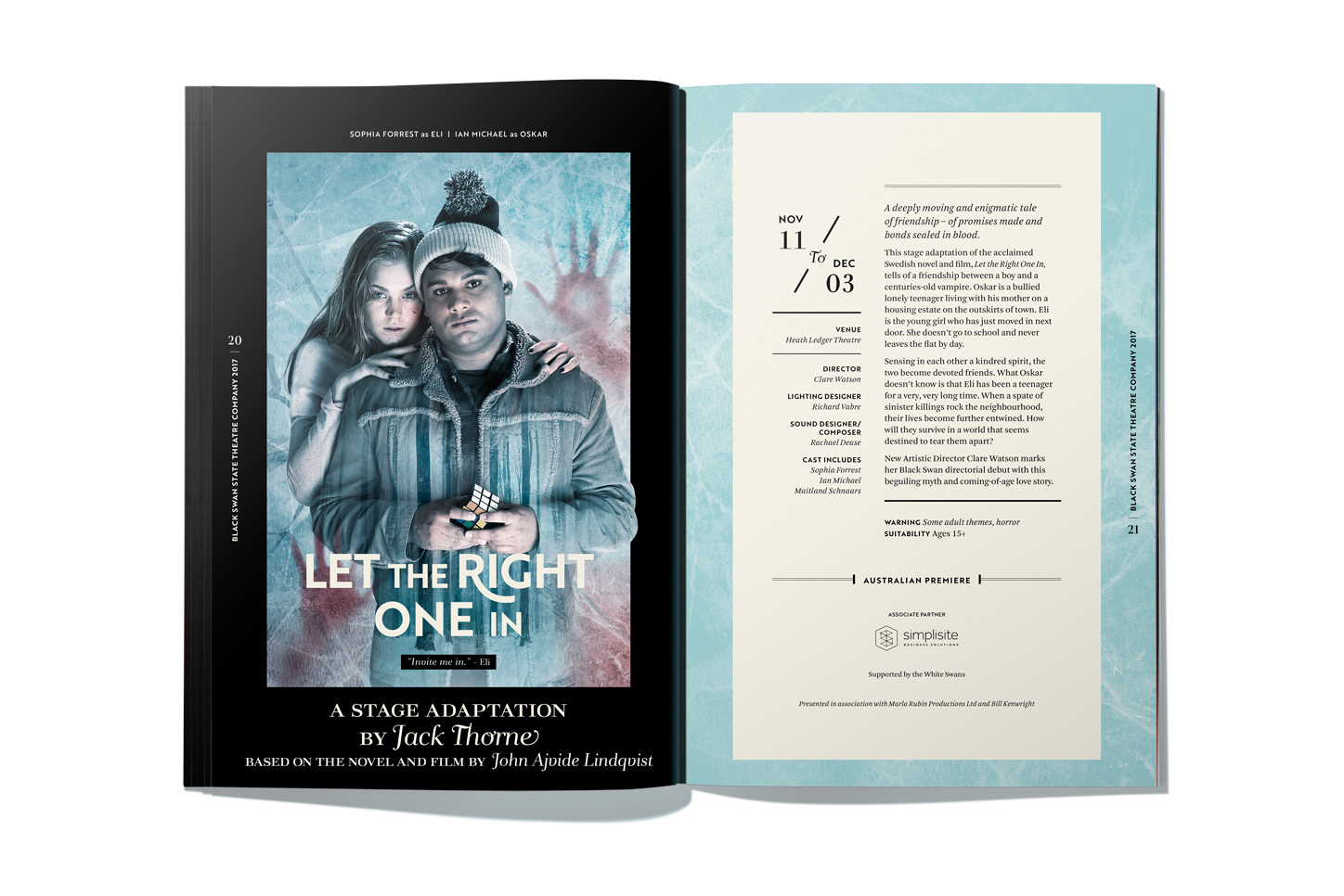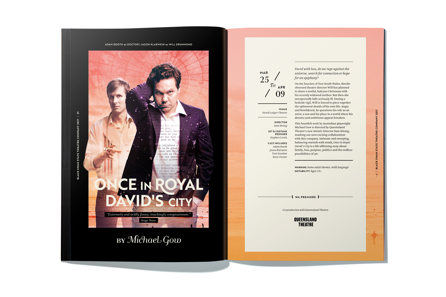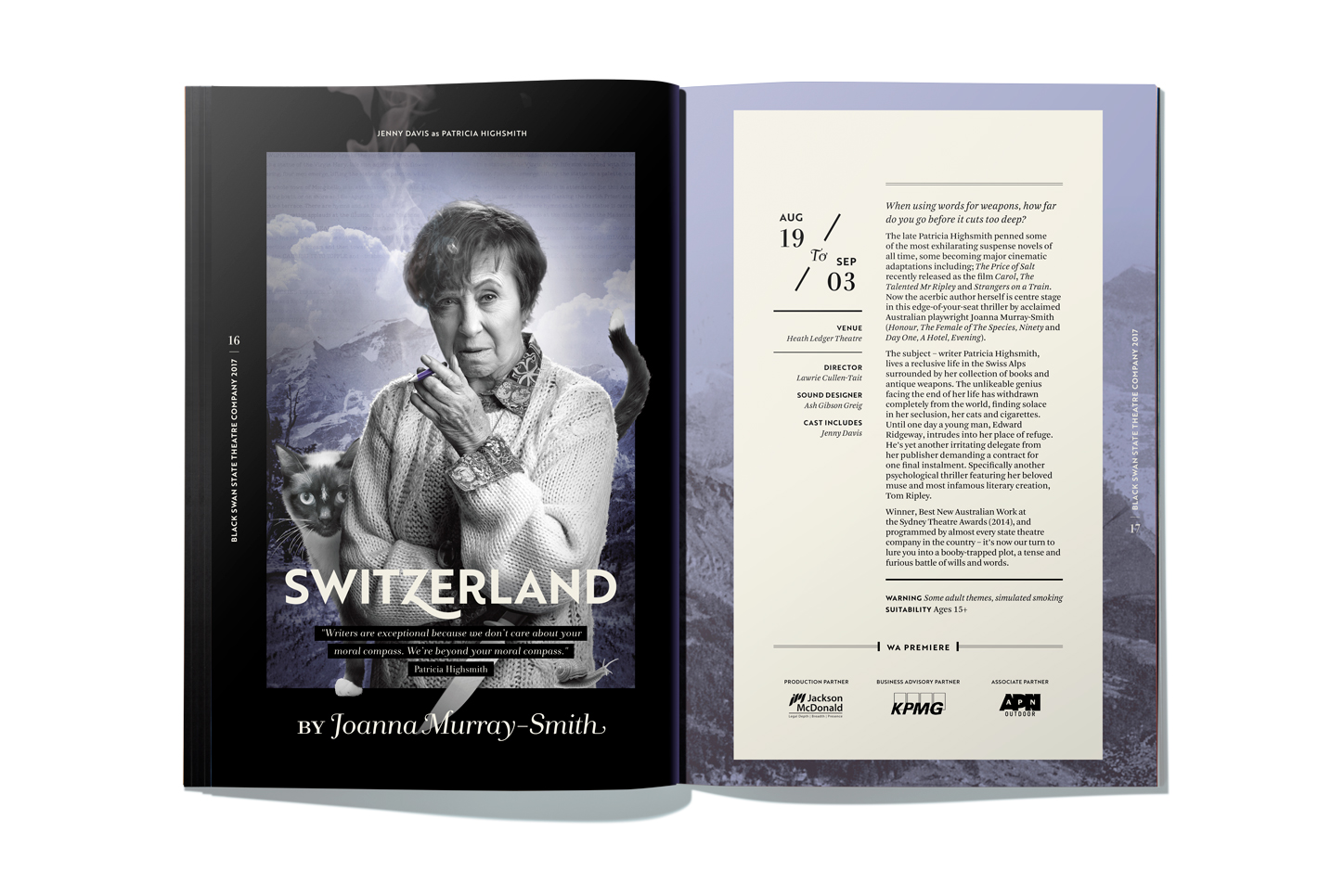 The cover design this year is an abstract interpretation of Kate Cherry’s vision of Black Swan’s longevity in theatre within the Western Australia environment. With limited time available to shoot a custom shot, Dessein turned to Salty Wings, a high-end digital photography agency set on showcasing the natural beauty of Western Australia. The image chosen, an aerial view of Roebuck Bay, Broome does just that. An assortment of colours and textures as the tide ebbs and flows onto the shores of the ancient red rock and sand synonymous to the Kimberly region of Western Australia. Taken to the next step, Dessein coupled with local printer Percival Print to attempt a unique finish not usually associated with conventional publication printing.Using our experience as packaging designers, our attention turned to using a packaging foil board as the replacement cover stock. Printing the image in 4 colour process with a special hard and fast-drying white ink to selective areas onto a silver foil board elevated the Western Australian landscape into an artistic expression of the colour and diversity of our culture and experiences. This distinctively different approach did not disappoint and became the talking point of patrons receiving the subscriber booklet at the initial launch.Although no theme was created intentional, it soon became an obvious an undercurrent of sub scapes existed.A ‘scape’ is defined as a noun or verb; a combining form extracted from landscape, denoting “an extensive view, scenery,” or “a picture or representation” of such a view, as specified by the initial element: cityscape; moonscape; seascape.Perhaps you could say, that in using a landscape, we were actually representing a number of ‘scapes’ from each play. We have a cloudscape, snowscape, streetscape, townscape, waterscape and of course the experience of escaping to a night of theatre. Whatever the view, the Black Swan State Theatre has most definitely taken flight across our state and nation. The bar is set high and we look forward to a colourful season in 2017.